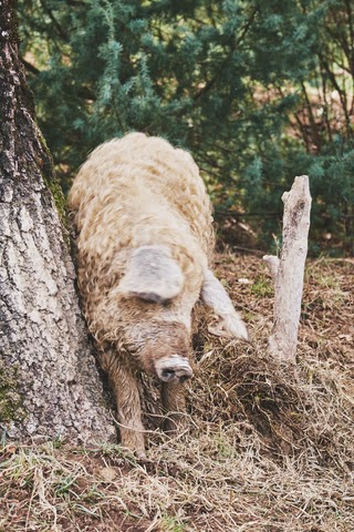 Wegens plots geen plek werden de nieuwe wolvarkens in de herfst en winter in de moestuin geparkeerd: omwoelen en bemesten; perfect!